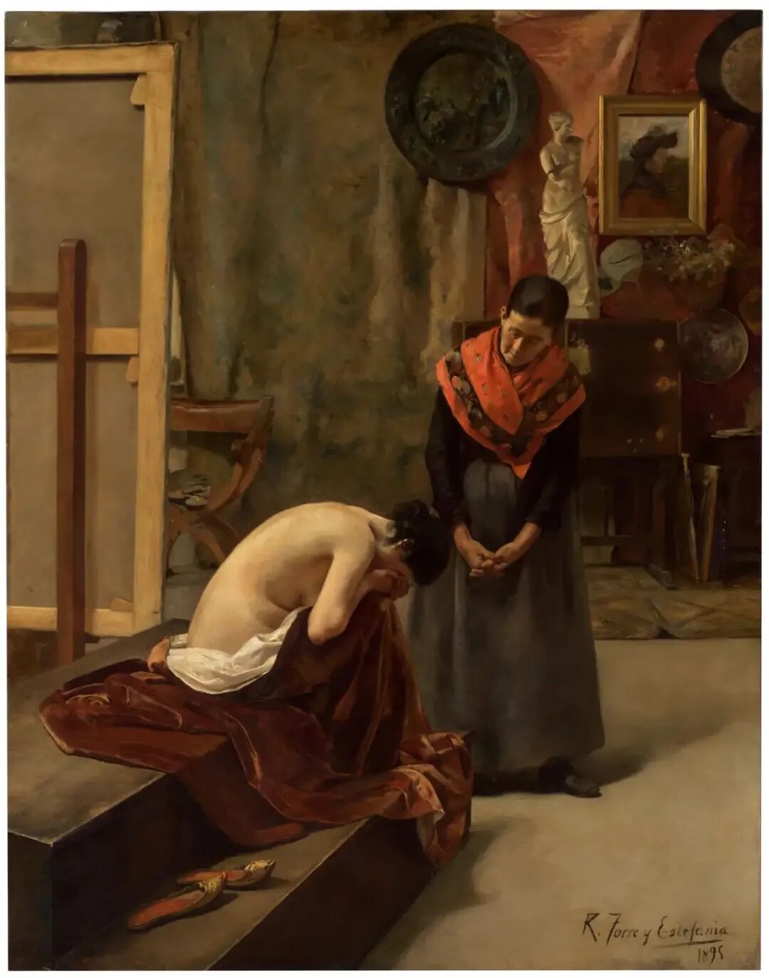画面上裸露着后背的女模特正低着头掩面而泣,而站在她前面的也是一位年长的老妇人,不知道她在对模特说啥,不过看她说话的样子,应该是在循循善诱,淳淳教导,语重心长地对她进行道德说教,以至于被骂哭了!
