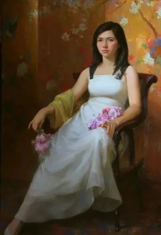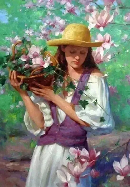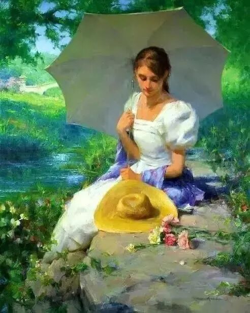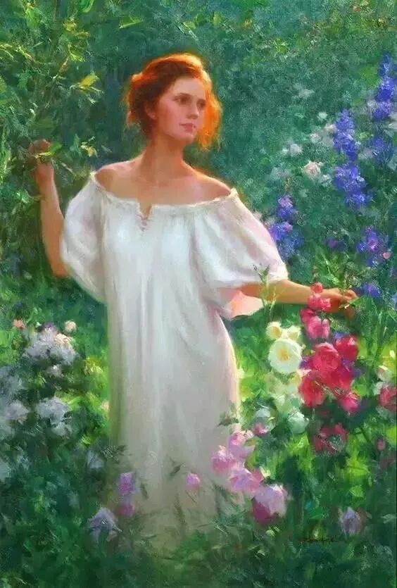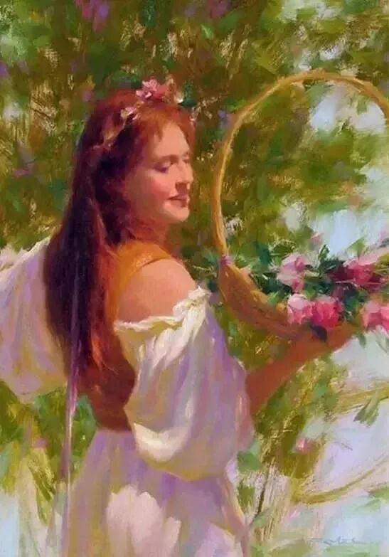 画面除了描绘绝色佳人的曼妙风情,其实更重要的是画布上所蕴含的温馨和美好,还有爱和温暖!绿意盎然、鲜花和美人互相辉映,相得益彰!