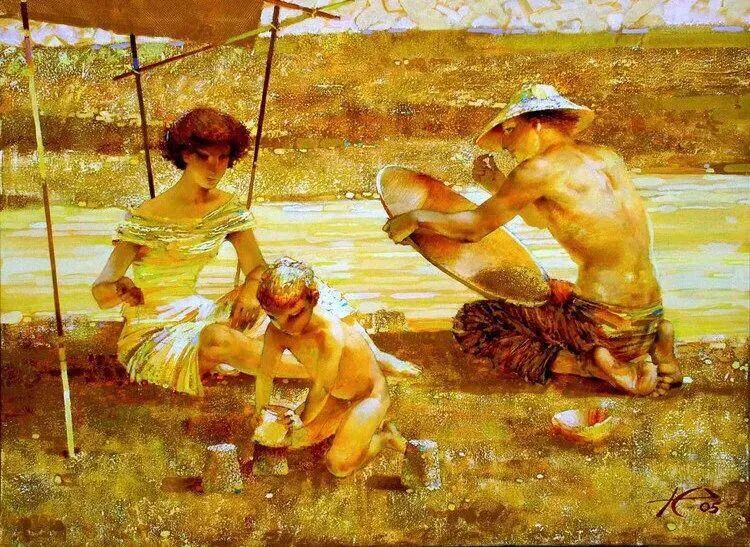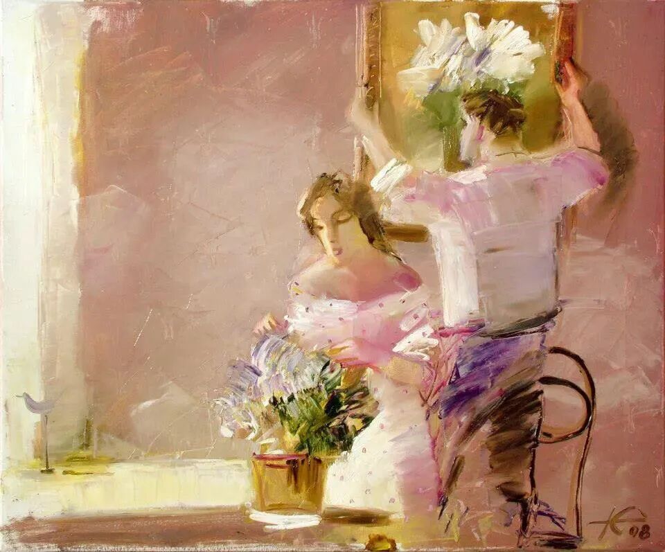 这个男人低头哈腰的形象,还有前面高傲的女士,使我想起了癞蛤蟆想吃天鹅肉!不知道画家是否有这个想法,还是我在瞎想!这位画家的作品,有时还有点幽默诙谐呢!
