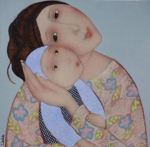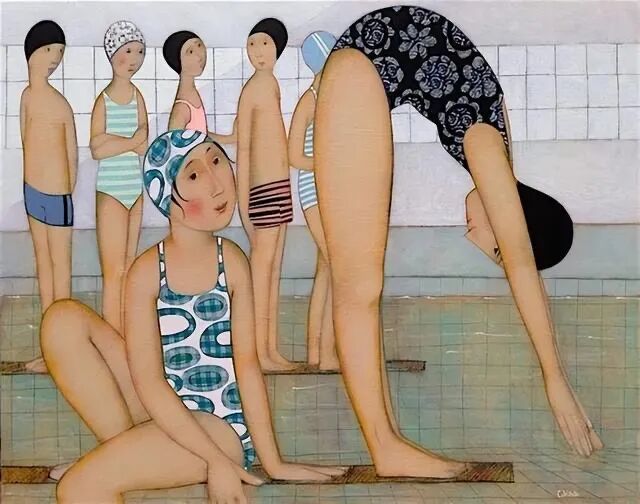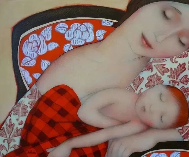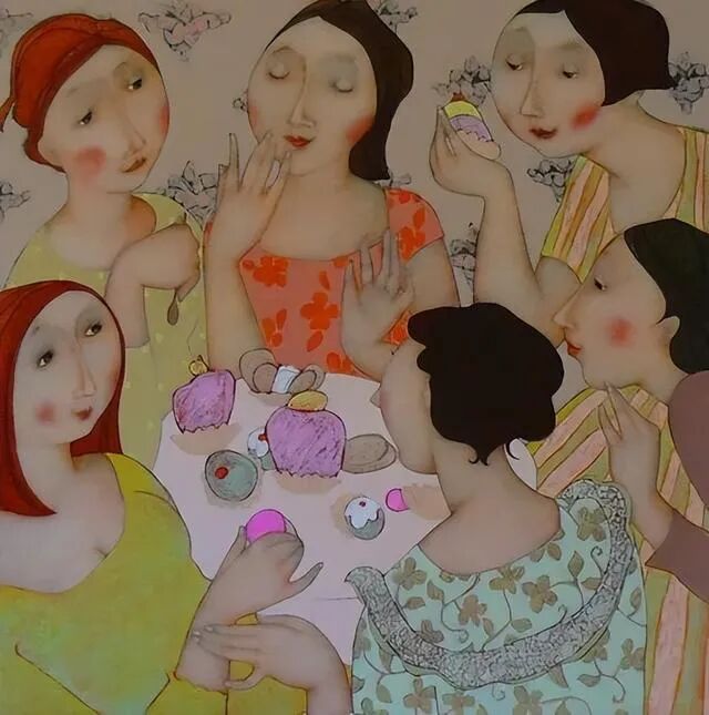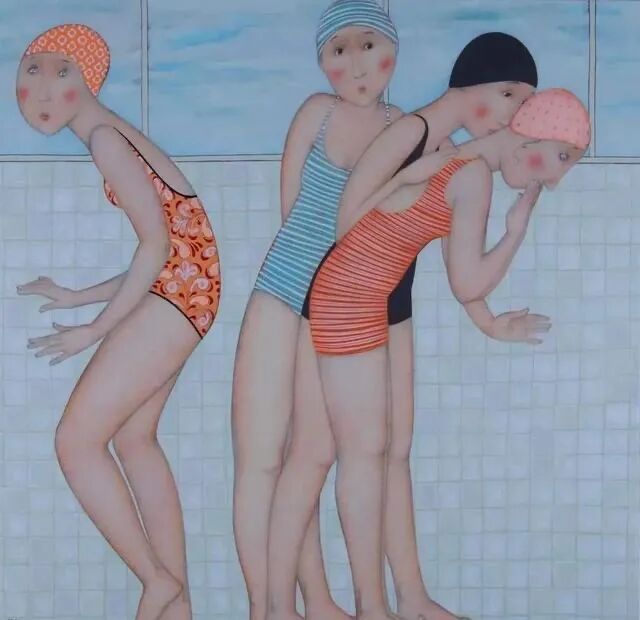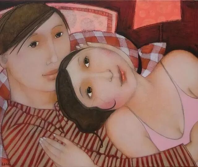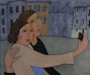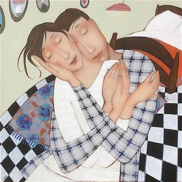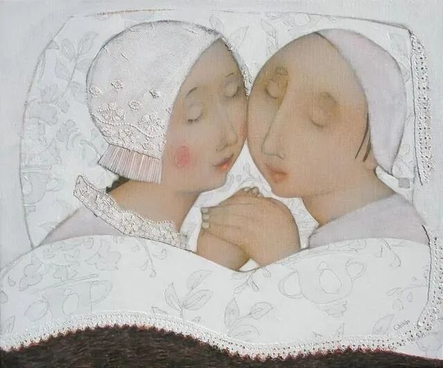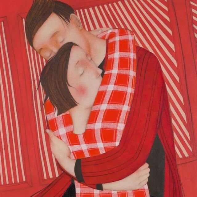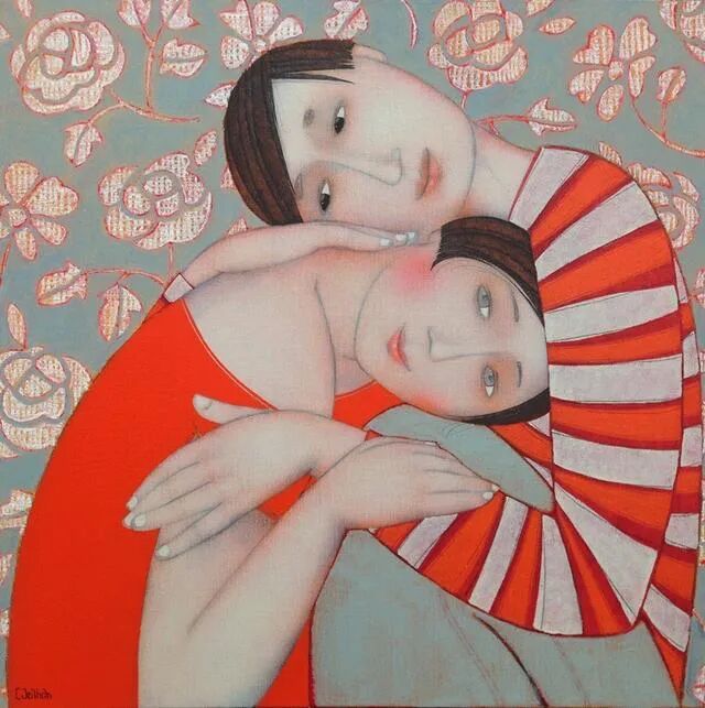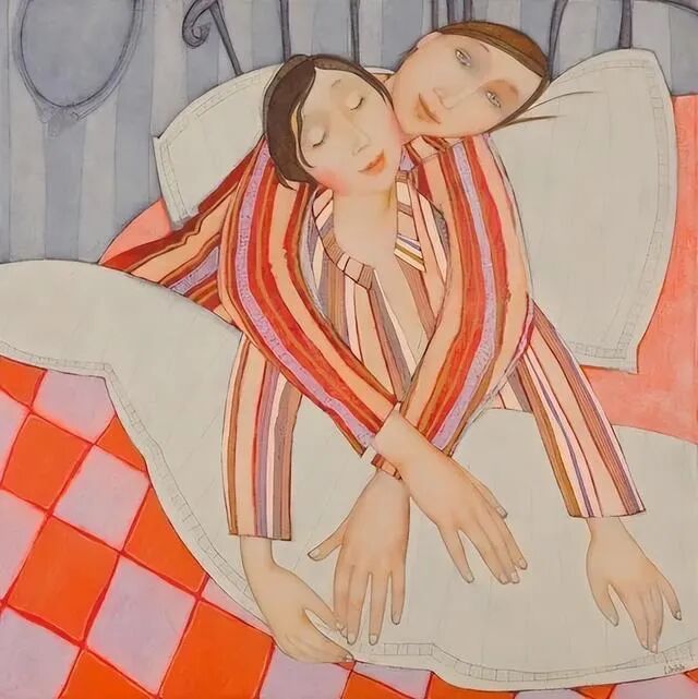 法国女画家Cécile Veilhan的作品,人物形象呈扁平型,红色的小脸颊,亮晶晶的小眼睛,特别会发光发热,能够照见平凡的车水马龙的喧嚣热闹的世界,让观者的内心也感觉特温暖幸福,缓解了孤独寂寞无聊!