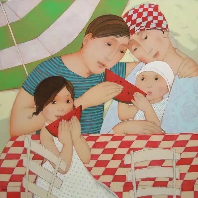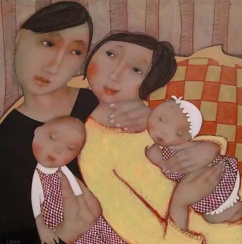 四口之家的画面,多么柔软温馨美好,不过眼神有点无奈,甚至有点辛酸苦辣,画家是想说明抚育两个孩子长大不易吗!