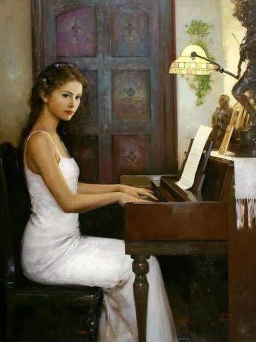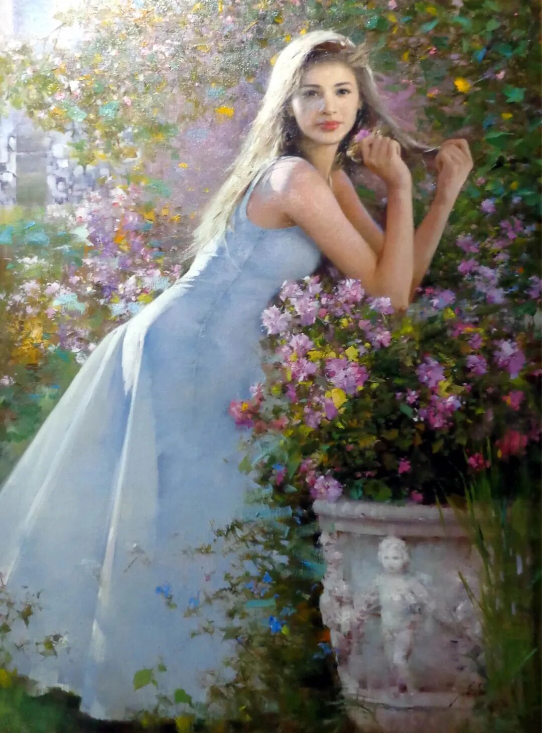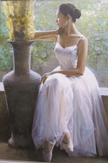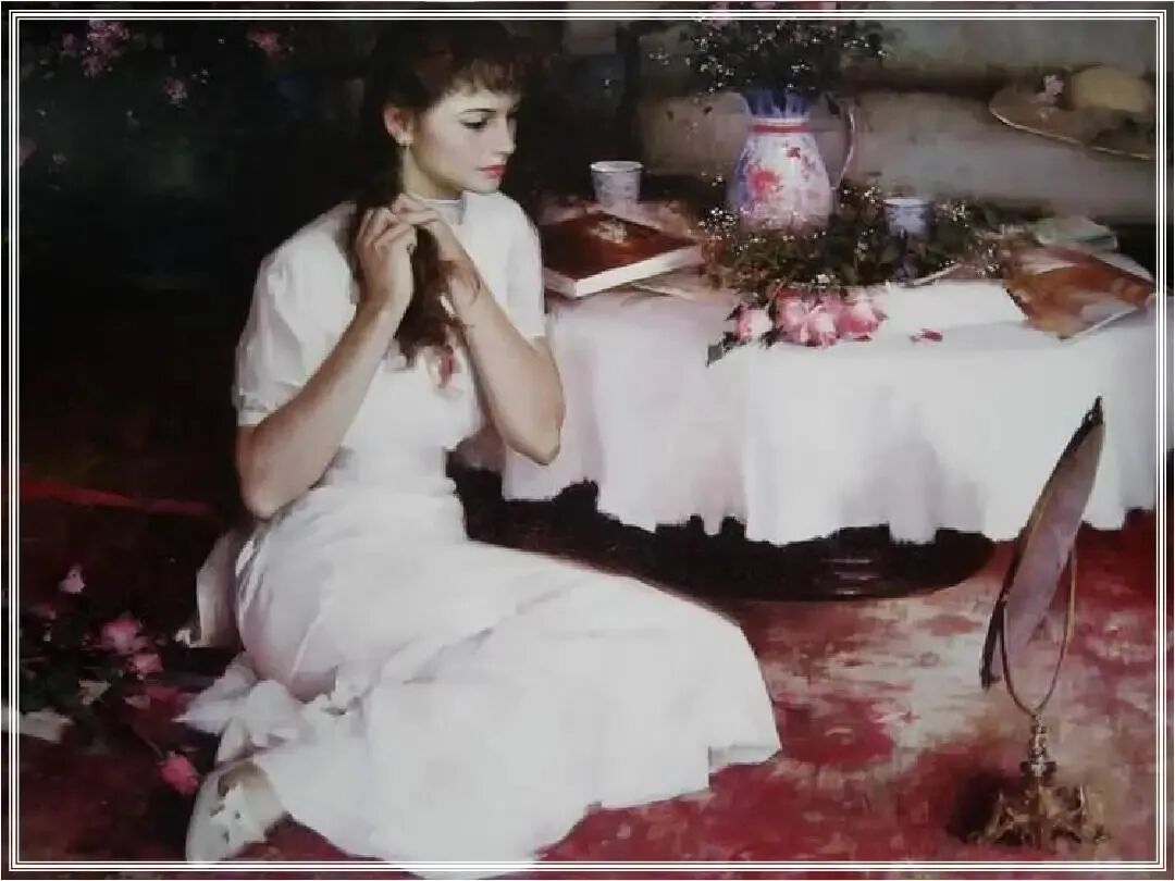 何岸的画作中,有很多白衣女子,既有西洋风情,也有东方神韵!何岸说,那些白衣女子是为了生活而作,而并非心里想画!他的文化和情感的根依然在祖国的怀抱里,在广州,在他曾经的军旅生涯!