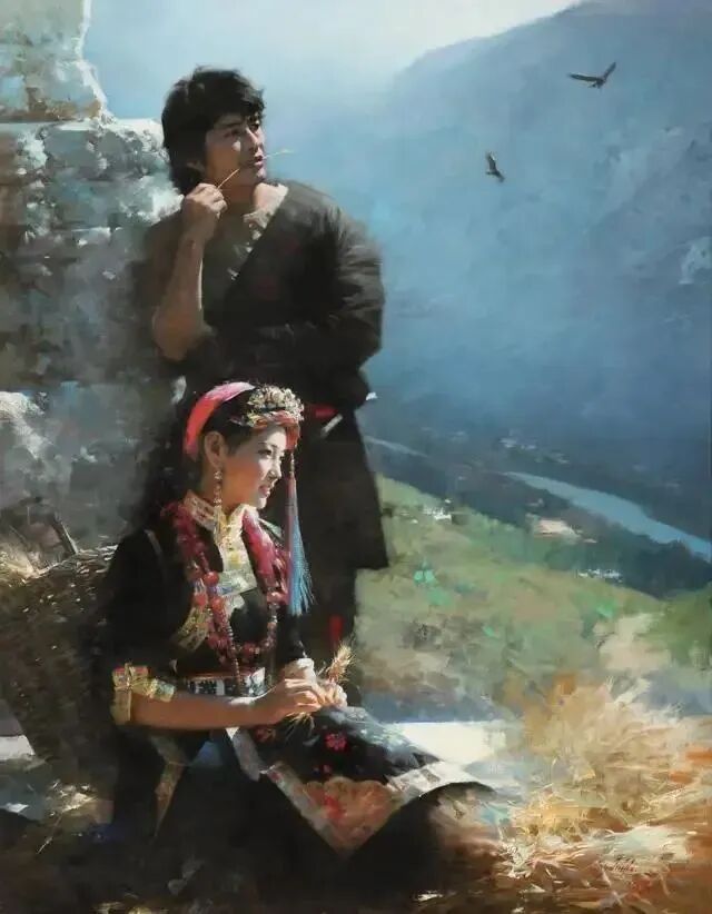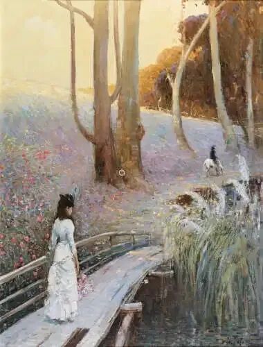 布面油画《暮归》,画面上描绘的是一位手捧鲜花的西洋女子走在小木桥上的背影,但背景的小木桥,还有远处男子骑着骏马的身影,感觉就像画家自己!他生活在美国的那些日日夜夜,虽然功成名就,生活富裕,但他一直向往着有一天能够回归祖国的怀抱!