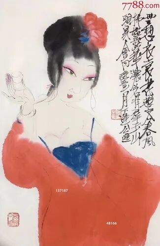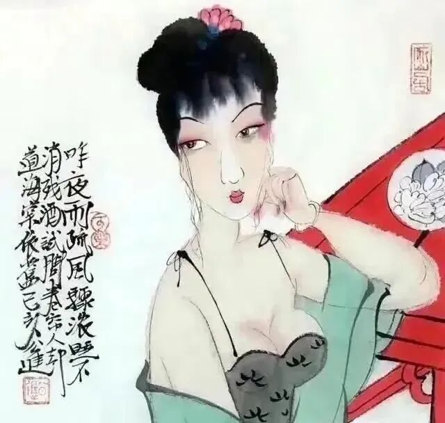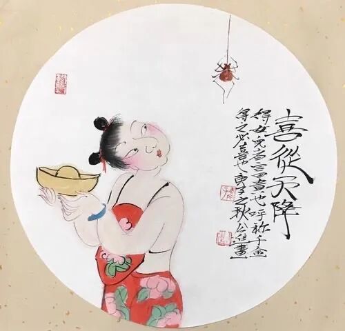 右上方掉下来一只喜蛛,民间有云,这是喜从天降,一言成真,果然掉下来一个金元宝,这穿红肚兜的女子既感到意外又喜出望外!