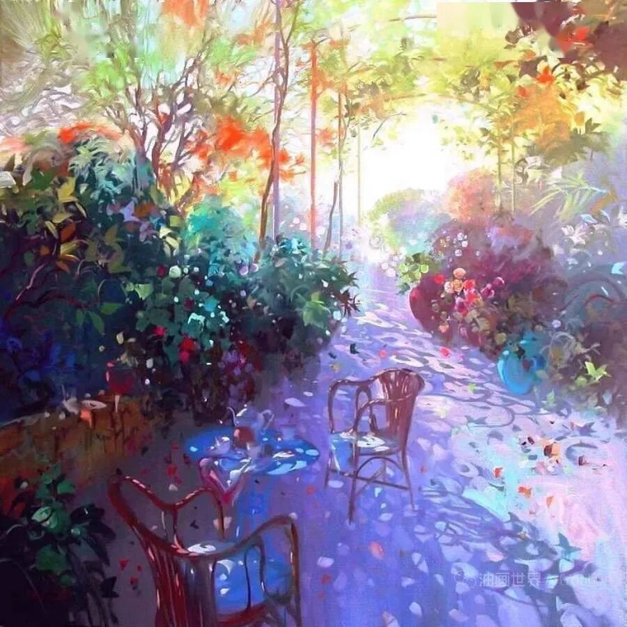 劳伦特特别擅长用彩笔捕捉灿烂的阳光穿过树叶间的空隙,一缕缕地洒满大地之美妙光影的色彩变化,并且会产生一种音乐般的律动感,就像音符🎵一样,愉悦观者的心情!