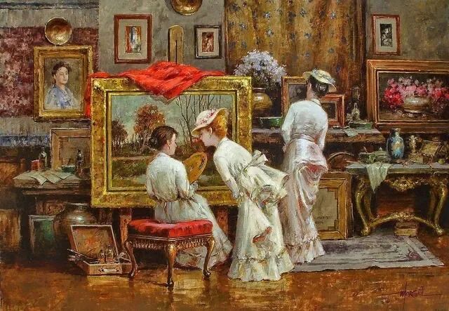 富人家的太太小姐们穿着绫罗绸缎,拖地长裙,很闲适地呆在家里讨论如何绣女红、布置家居装饰等!