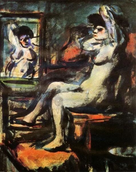 这幅《镜前裸妇》,描绘的是一名丑陋的妓女,其实画家是借那面镜子折射当时腐败黑暗的社会,是赤裸裸的揭露!画面上颜色昏暗,女子毫无美感可言,散发出一种堕落沉沦的气息!
