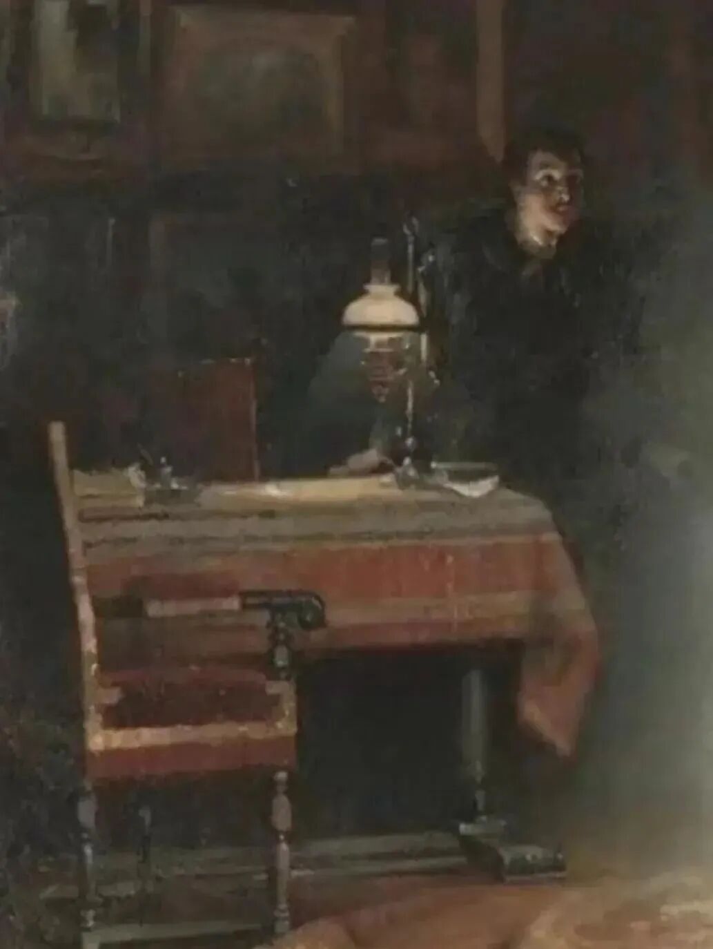 画中男人看起来是一名普通的工人,夜以继日做工赚取微薄的收入养活自己,他也梦想着红袖添香,于是出现了画中的那名女子,看背影和轻盈飘逸的体态,我们就知道她不是一名劳动者,更像是贵族太太或者名门望族小姐,出身不俗,锦衣玉食!这位男子可谓是癞蛤蟆想吃天鹅肉!