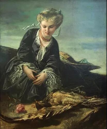 这是画家的自画像,画面为灰黑色基调,头转向一边,手指夹着一支正在燃烧的香烟,高傲自大,卓尔不群,这也是文艺复兴晚期威尼斯画家的个性特征!