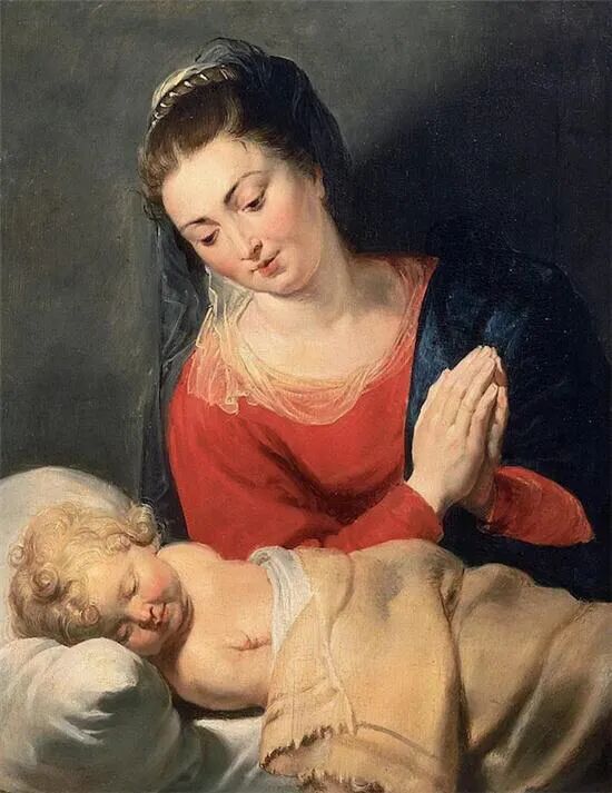 母亲的责任除了养育孩子茁壮成长,还有就是让他变得越来越优秀!此幅画的圣母正在打孩子的屁股,感觉就是巴掌举得很高,可落到下面时估计就是变成一阵微风细雨了,也就是吓唬一下,让他听话罢了!