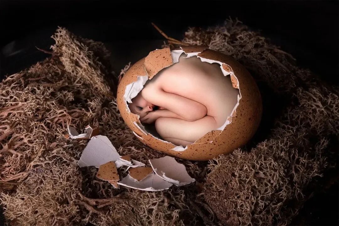 鸡蛋里本来应该孕育一个鸡宝宝,却变成了一个裸体的婴儿,非常具有象征意义,使我想起了“脱胎换骨”这四个字!