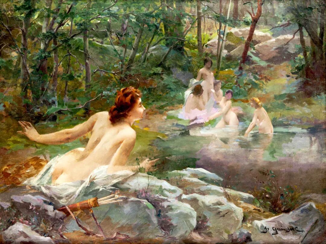 保罗·弗朗索瓦·昆塞克创作的《森林中的宁芙》,描绘了一群仙女正在森林的小溪流里嬉戏沐浴,自由自在、无拘无束、身心得到了充分的释放,画家在此幅画中倾诉了内心对自由和无忧生活的期待和向往!