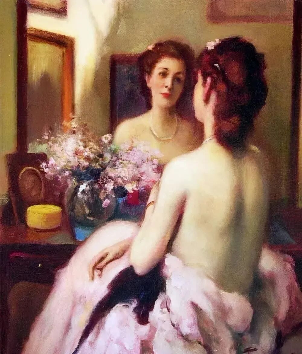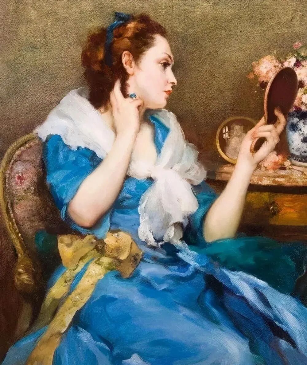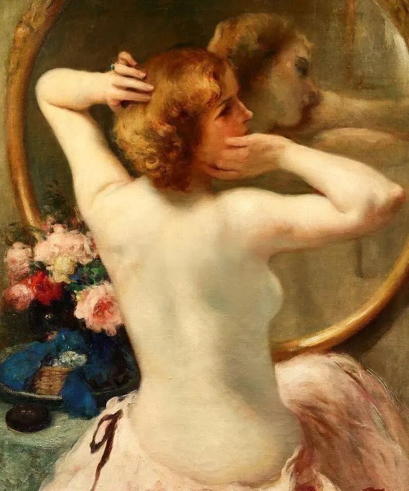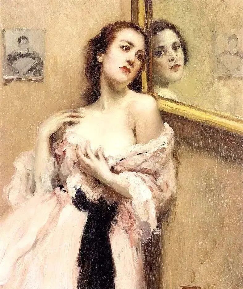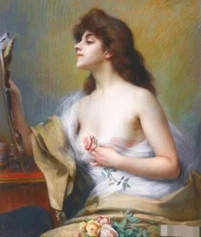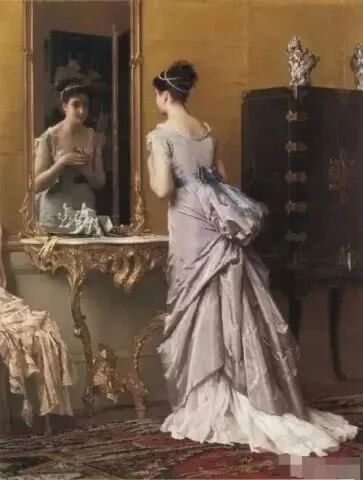 比利时浪漫主义画家费尔南德·图森,特别擅长通过镜子,多角度刻画女人的优雅,可以说365度无死角,脸部、颈部、背部、肩部,女人无论从哪个角度观赏都很美!