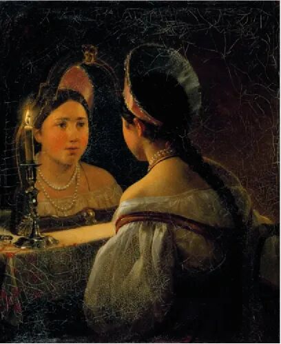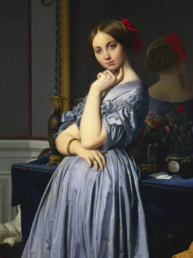 安格尔的一幅名作,画中的主角是法国散文家、传记作家德豪森威尔伯爵夫人。这是一位精神和物质生活都心满意足的夫人,她站在镜子前面,以优雅的姿势目视观者,镜中的影像,则是表示你中有我我中有你,营造着一种岁月静好的氛围。