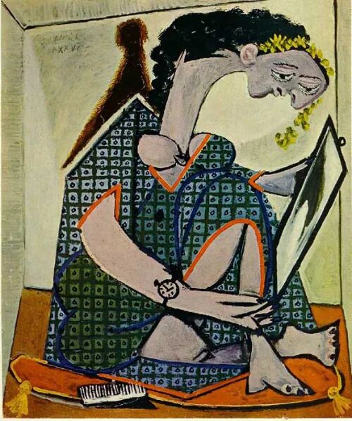 最后一幅《照镜子的女子》,是20世纪初西班牙画家毕加索创作的一幅油画,这位画家通过镜子非常冷酷地折射了女人丑恶的嘴脸,五官都移位了,那心灵呢……