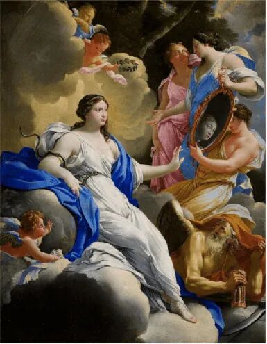 在安妮贝尔·卡拉奇的《真理与时间的寓言》中,画面上真理手持一面镜子,时间老人出来揭穿谎言,使之无处遁形,原形毕露!此时真理散发光芒,欺骗被践踏在她的脚下,这就是心如明镜!