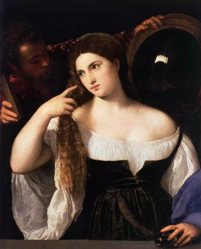 提香的《对镜的维纳斯》,这幅画里也有一面镜子,那是维纳斯的情人,镜子里有一扇窗户,暗示他是从窗户偷偷溜进来的!而梳头发的动作,表示女人纠结的心思,可能是在和情人互诉衷肠,然后即将依依惜别,因为毕竟是偷情!
