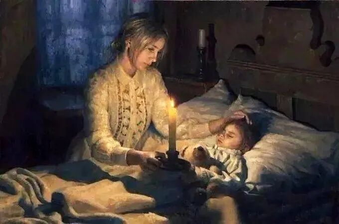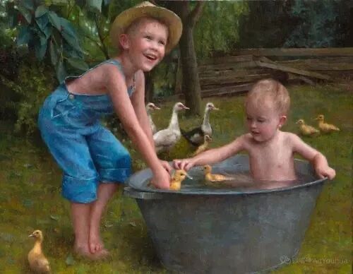 弟弟在浴桶里沐浴,做哥哥的为了逗弟弟开心,把一只小鸭子也放了进去,看他笑得多开心😃,似乎我也被感染了呢!画家把这一场景定格在画面上,愉悦了自己也感染了观者!