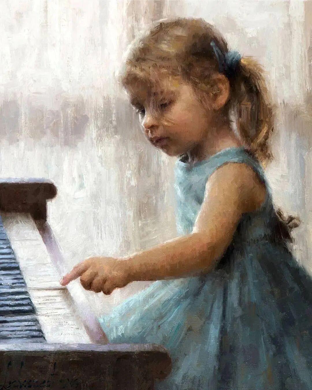 除了描绘儿童世界,布兰德克里德还把模特和他画作同框,这样一目了然地显示了他高超的人像绘画功底!