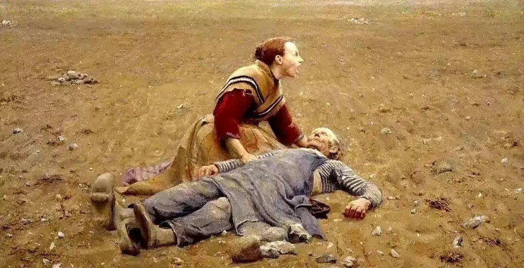布兰德克里德1889年创作的《破旧》,画面上一位农场工人躺在田地里,也许已经到了生命的尽头,他的老伴在呼喊求救,可在这偏僻的空无一人的地方,谁也听不到她的呼唤!这幅画于1893年在世界哥伦比亚博览会上展出,获得了巨大的成功!