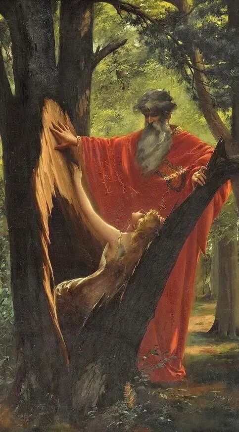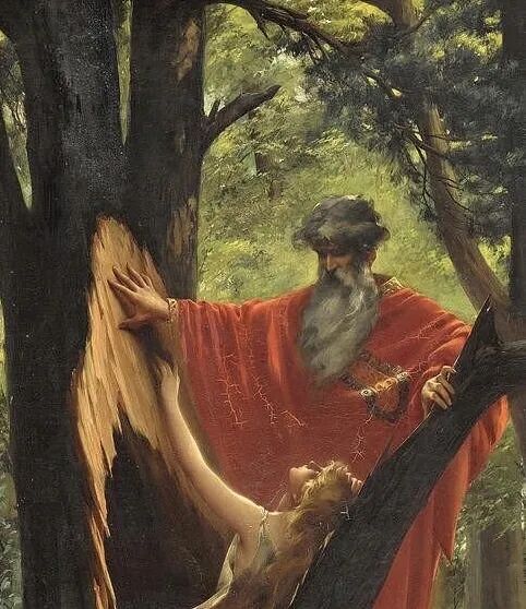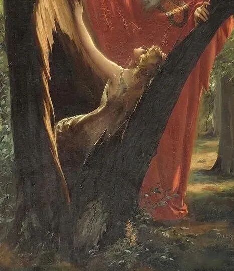 这幅画取名《暴风雨》,如果仅从画面上看,应该是在暴风雨来临之际,小女孩非常害怕,一位穿着红长袍的法老正在安慰这位小美女,并让她躲进了这棵劈开的树中!
