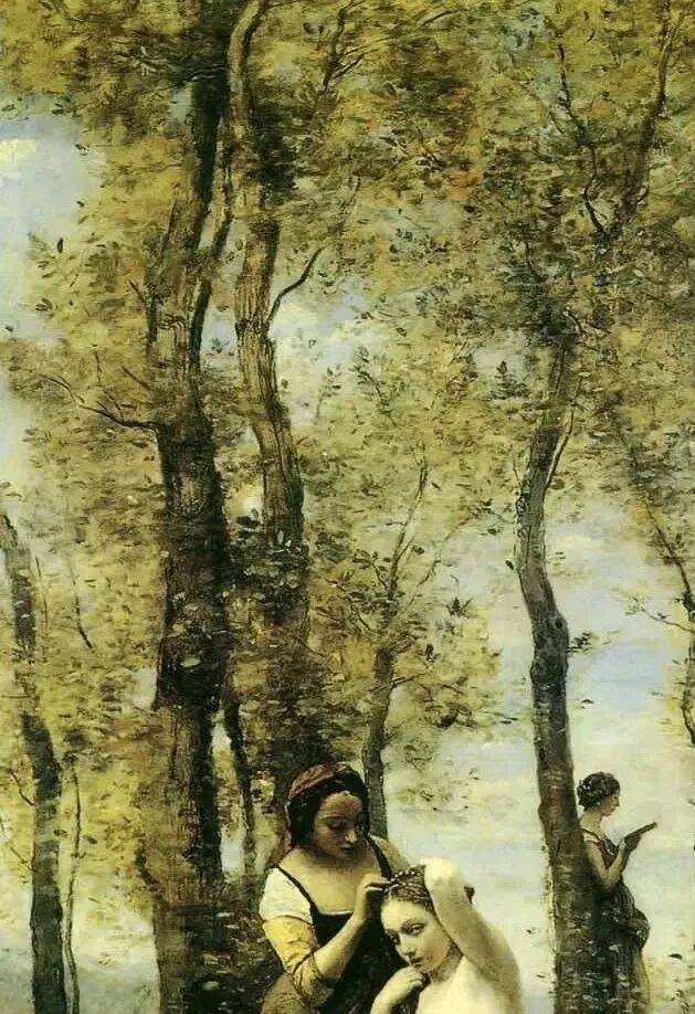 柯罗喜欢把自己想象中的少女安放在宁静诗意的大自然中,以达到人与自然和谐共处的境界,我想那些女子也许就是上天送给他的妻子,他心目中的伴侣!
