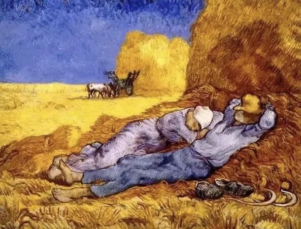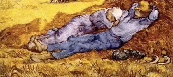 这是梵高先生创作的一幅关于麦田守望者的画作,画面上的这对农民夫妇,女人幸福地偎依在男人宽厚结实的胸膛上,满满的安全感幸福感,而男人则压低了帽檐,背靠在柔软的麦秸杆上,不知不觉进入了梦乡!