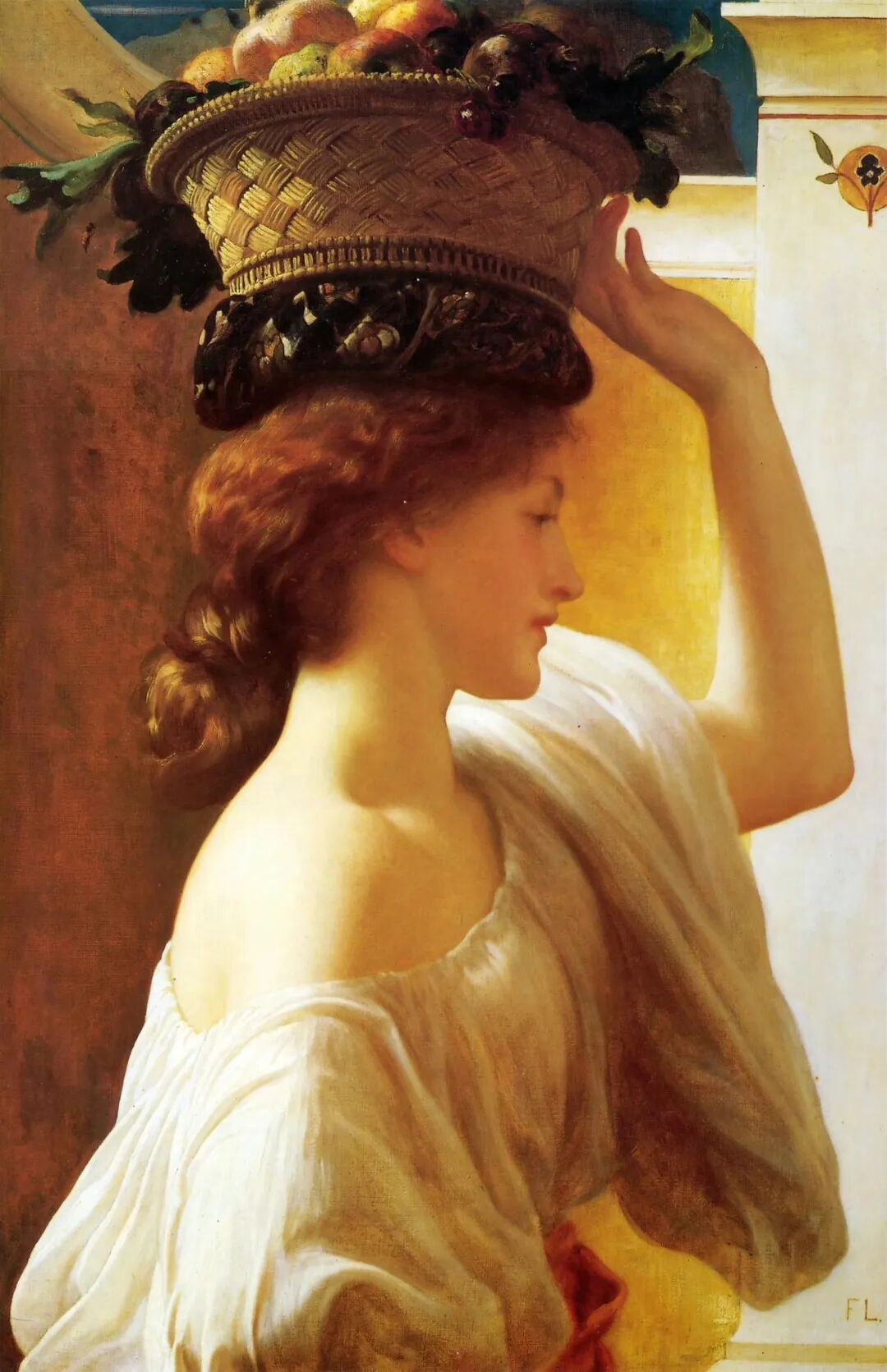 在金黄色光晕渲染中的女孩,显得格外的引人瞩目,那露肩的肌肤、金黄色的卷发和头顶的水果篮互相辉映着女孩天使般的面容!
