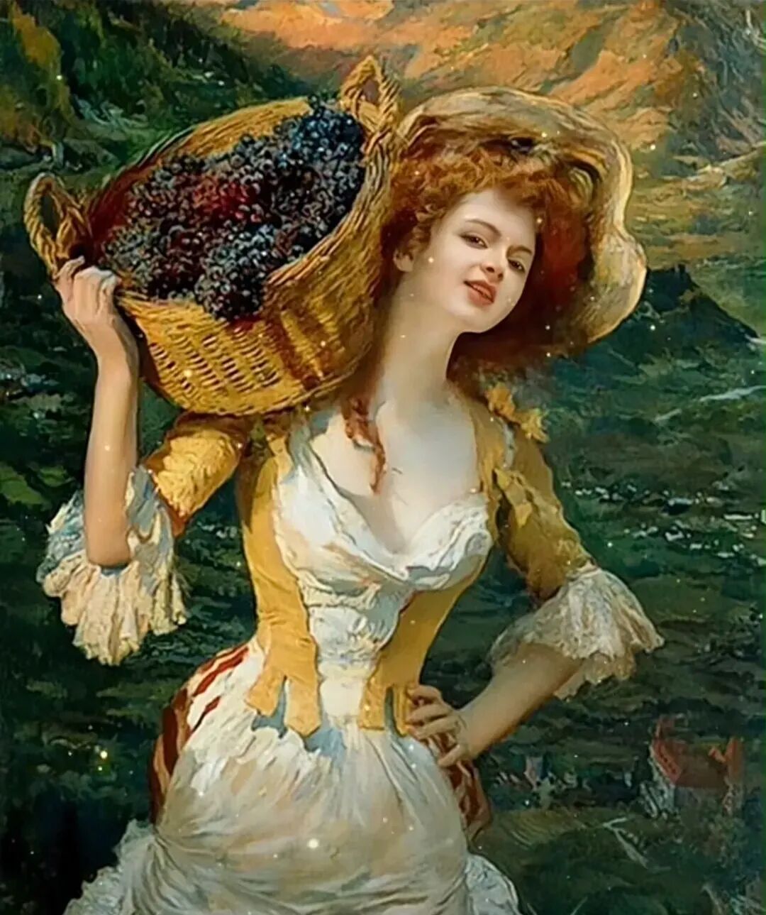 女孩头上的水果,代表丰收和收获,画家是想把这一篮水果献给谁呢!当然是我们每一位欣赏者了,这也是画家的一片爱心💗!