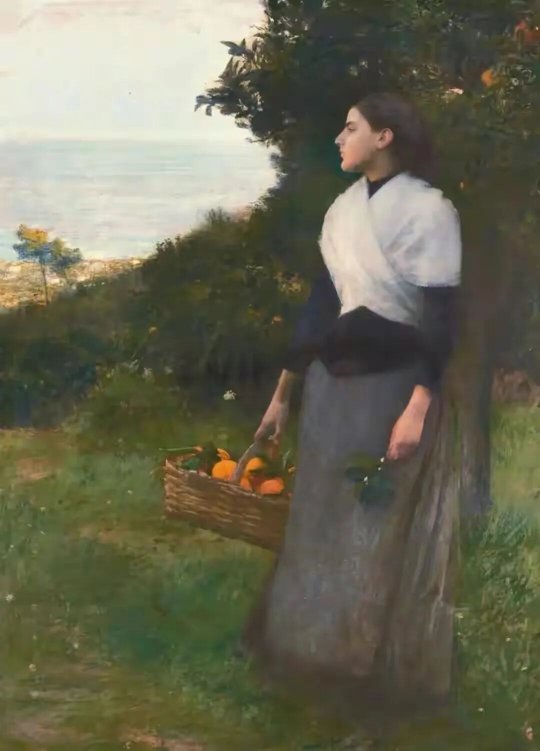 法国画家帕斯卡-阿道夫-让·达仰-布弗莱所创作的一幅油画,女孩靠在橘子🍊树下,一只手拎着一篮大橘子,另一只手采了一支开满小白花的橘树枝,而她却好像心不在焉,在遥望着另一个方向!那是在期待爱情开花结果吗,而她此时正思念着远方的爱人,不知道他何时才能归来,因而神情显得有些落寞,画家把女孩此时此刻盼望的心情,刻画得非常到位!