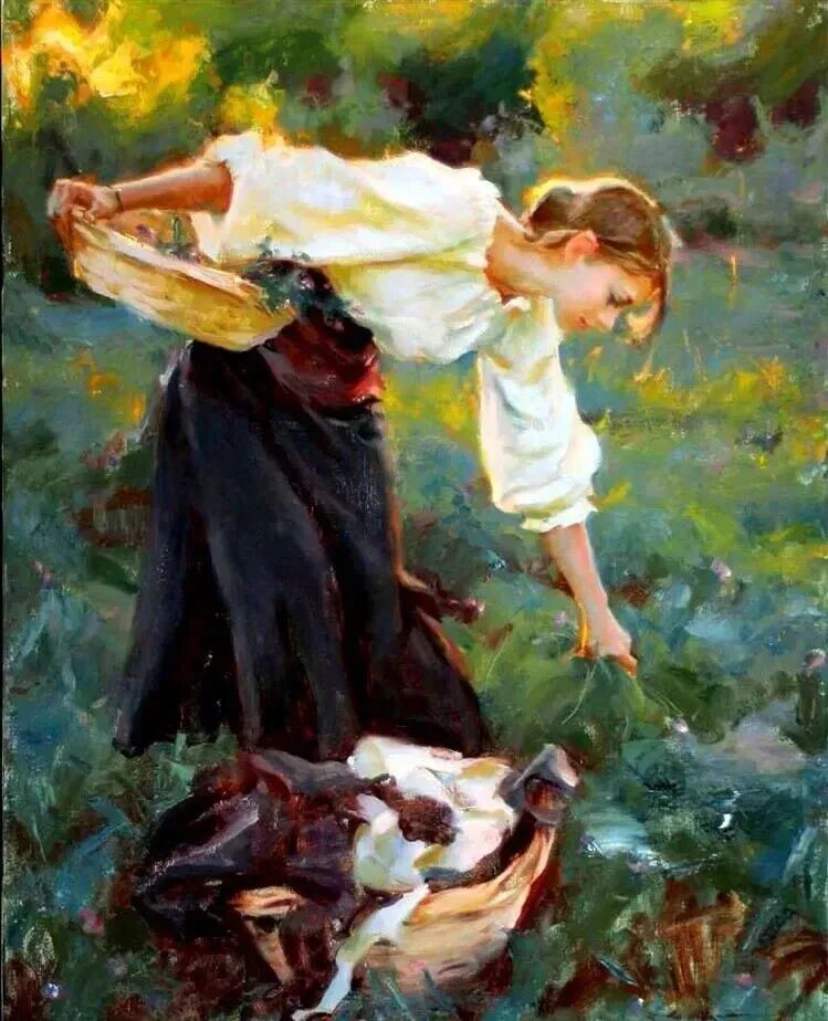 印象现实主义画家迈克尔·马尔姆创作的弯腰的采花姑娘!晨曦中,朝阳冉冉上升,普照万物,一位白衣黑裙的姑娘在花丛中采集花朵!