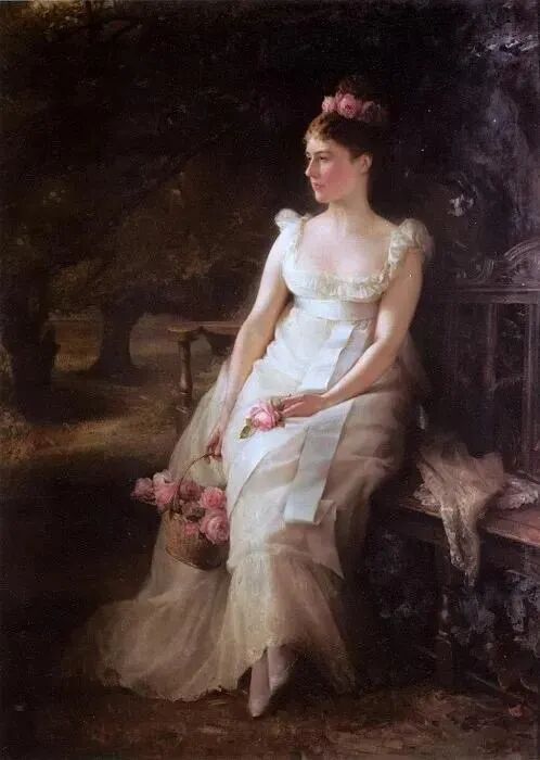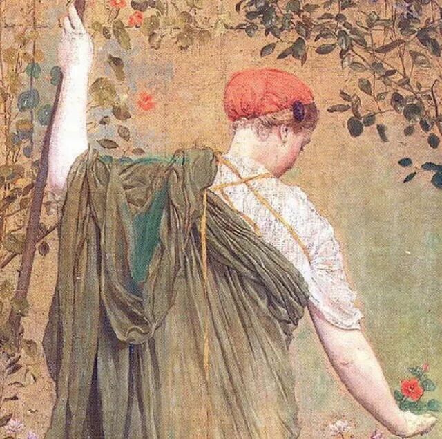 约瑟夫.摩尔创作的这幅《花园》,画面上也是一个摘花女孩的背影,造型有类似的地方,不过意境稍逊一筹!