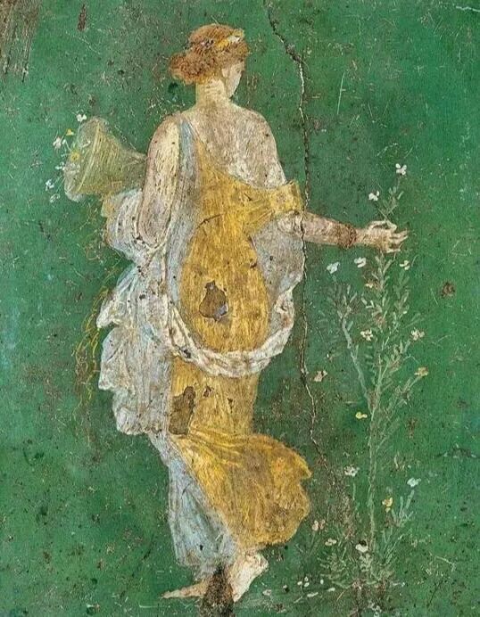 公元1世纪的庞贝壁画《花神芙罗拉》,花神芙罗拉,代表着春天和鲜花,画面上她正赤脚漫步在花园里,步履轻盈,裙裾飞扬,左手抱着一个花篮,右手正在掐一枝花,那圆筒状的花篮就像是一只喇叭🎺,此时正在宣告春天的来临!画家虽然只是描绘了一个远去的背影,但使欣赏者产生了无限的遐想!