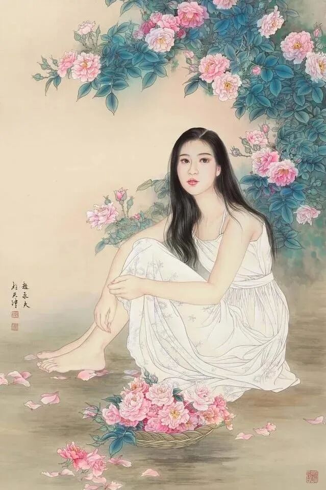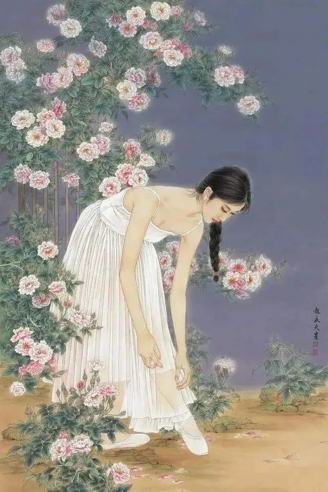 画家赵永夫创作的《花中女孩》、《牡丹仙子》,沐浴在花丛中,身穿白色衣裙的女孩,犹如花仙子,在花丛中翩翩起舞!