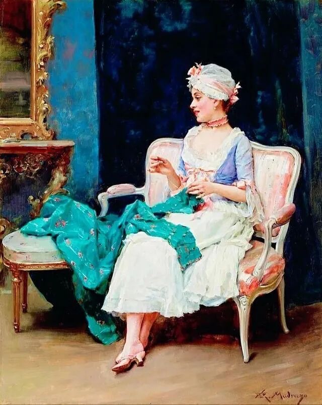 一位穿着朴素但美丽大方的家庭主妇,坐在那里安静地缝补衣服,脸上还带着一丝微笑,补衣服的日常琐事,画家把她刻画得如此优雅高贵!