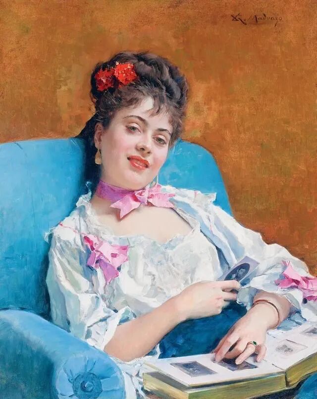 你有没有曾经某个时刻,如画布上这位明眸皓齿的女孩一样,坐在椅子上翻看以前的相册,然后看到某张照片,就会心一笑,想起了那一段令人难忘的美好时光!