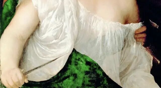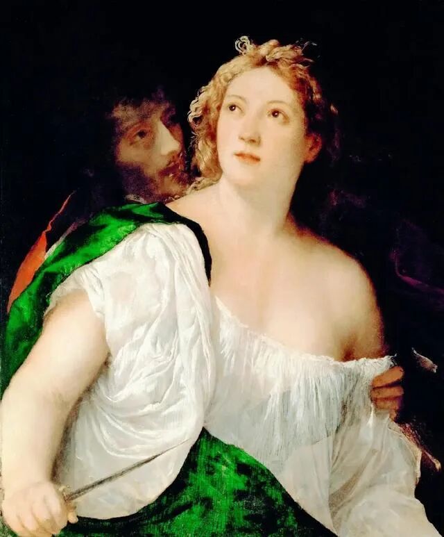 这幅画描绘了一位貌美如花的罗马贵妇人卢克丽霞自杀的故事,画面就展现了她拿着一把尖刀刺向自己胸膛的场景,非常慷慨地赴死,就像一位女英雄!
