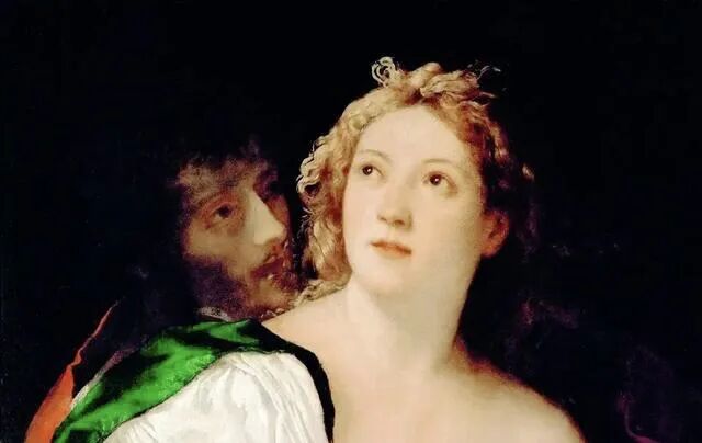 那这么漂亮的贵妇人为何要选择自杀呢!从现场的情景来看,卢克丽霞金黄色的头发有些凌乱,还裸露着一只白皙的肩膀,白色的衣衫不整,而后面一位贼眉鼠眼不怀好意的男人还将一只罪恶的手放在她肩膀上,似乎在拉扯!