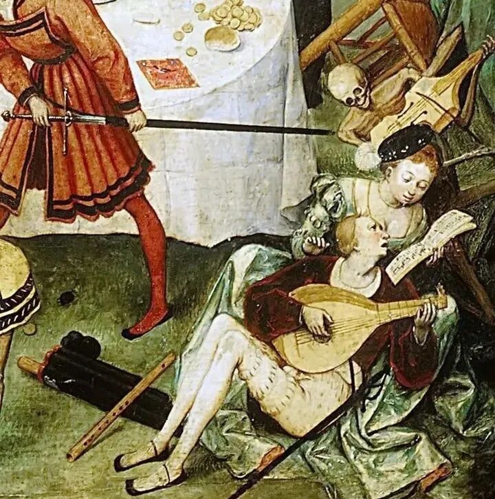 骷髅头代表死神,那把剑代表当时的瘟疫,它会随时随地会夺去这一对沉浸在幸福中的情侣生命 ,当然不是一对,还有很多家庭正面临死亡的威胁!