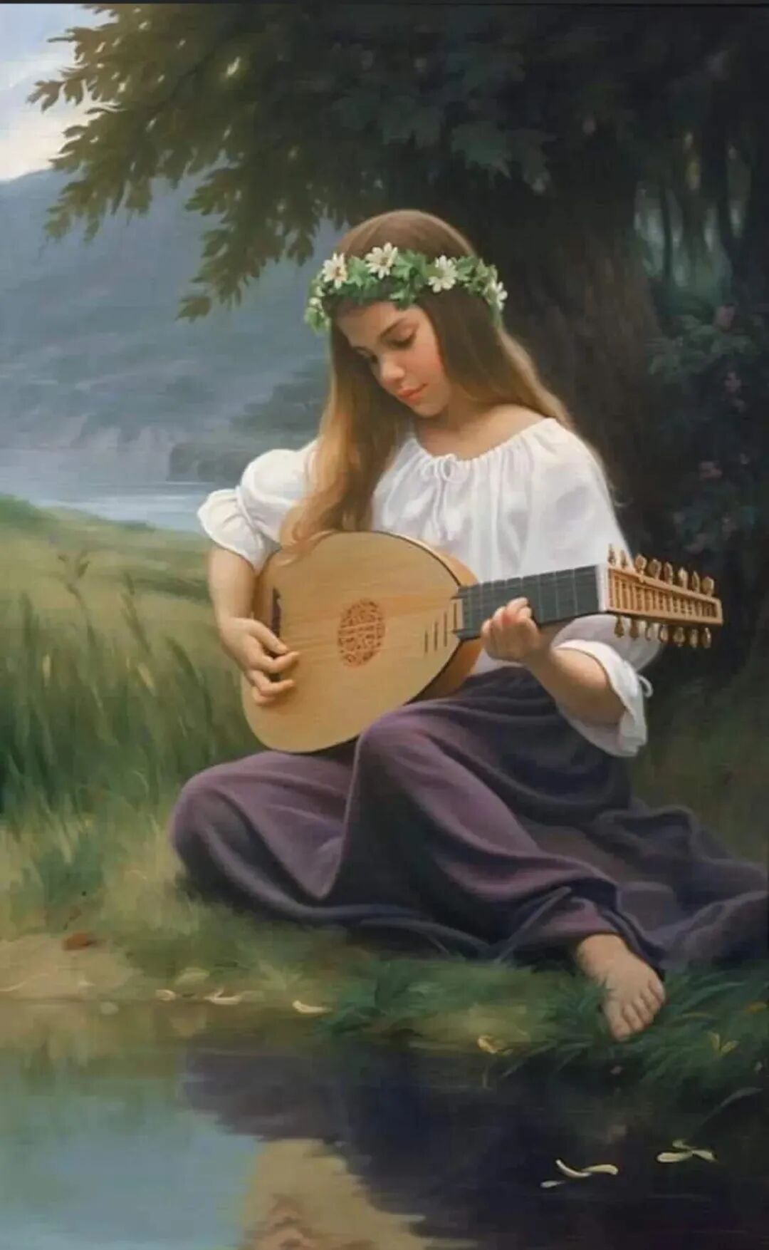 美国画家马克·艾里安创作的《河边弹琴的女孩》,那是春天的奏鸣曲,犹如泉水叮咚,潺潺流淌!
