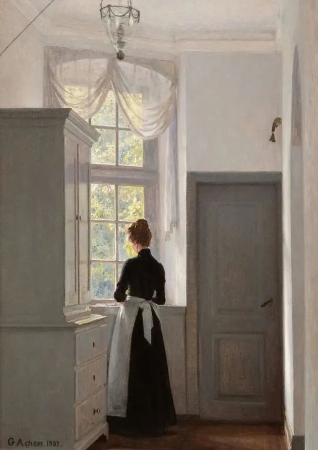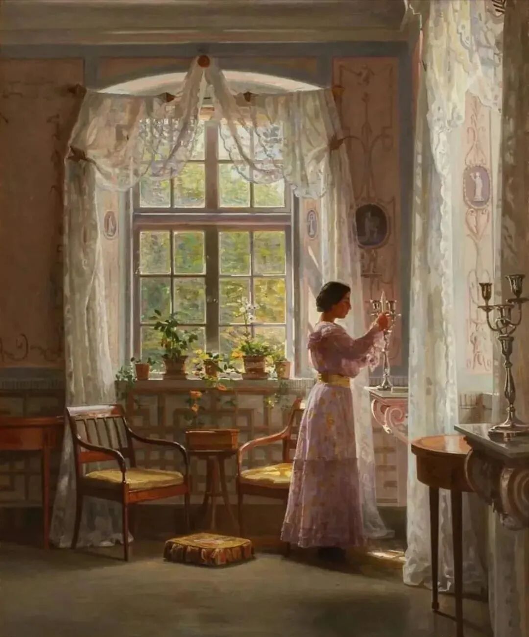 在利塞隆德城堡庄园的清晨,贤惠的女主人正在小心翼翼一心一意地擦拭着烛台,现世安稳,岁月静好,画面温馨,这幅画由丹麦画家格奥尔格·尼科莱·阿钦Georg Achen创作!