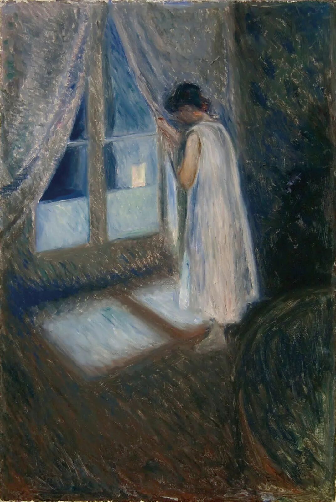 19世纪至20世纪挪威画家爱德华·蒙克的《窗边之吻》和《窗边的那个女孩》,前者很大胆,后者只是偷偷的在窗帘后面看楼下等待的男友!姑娘,想爱就下去吧,别犹豫!