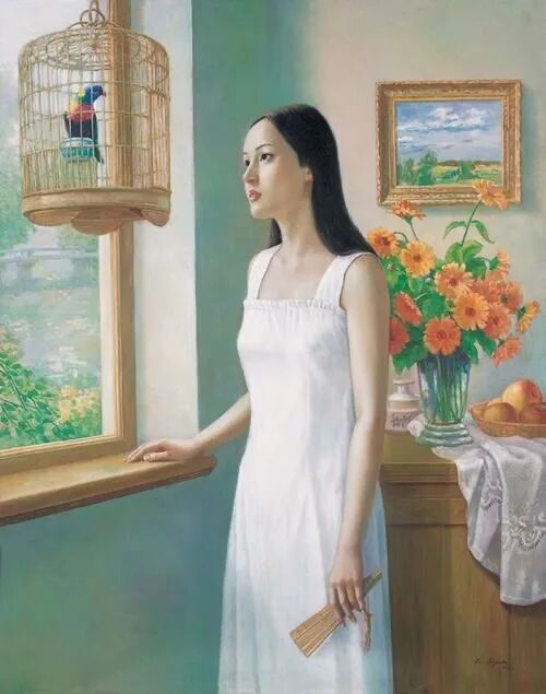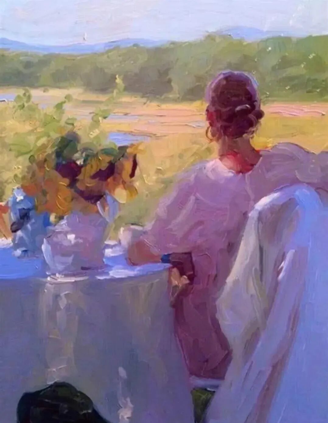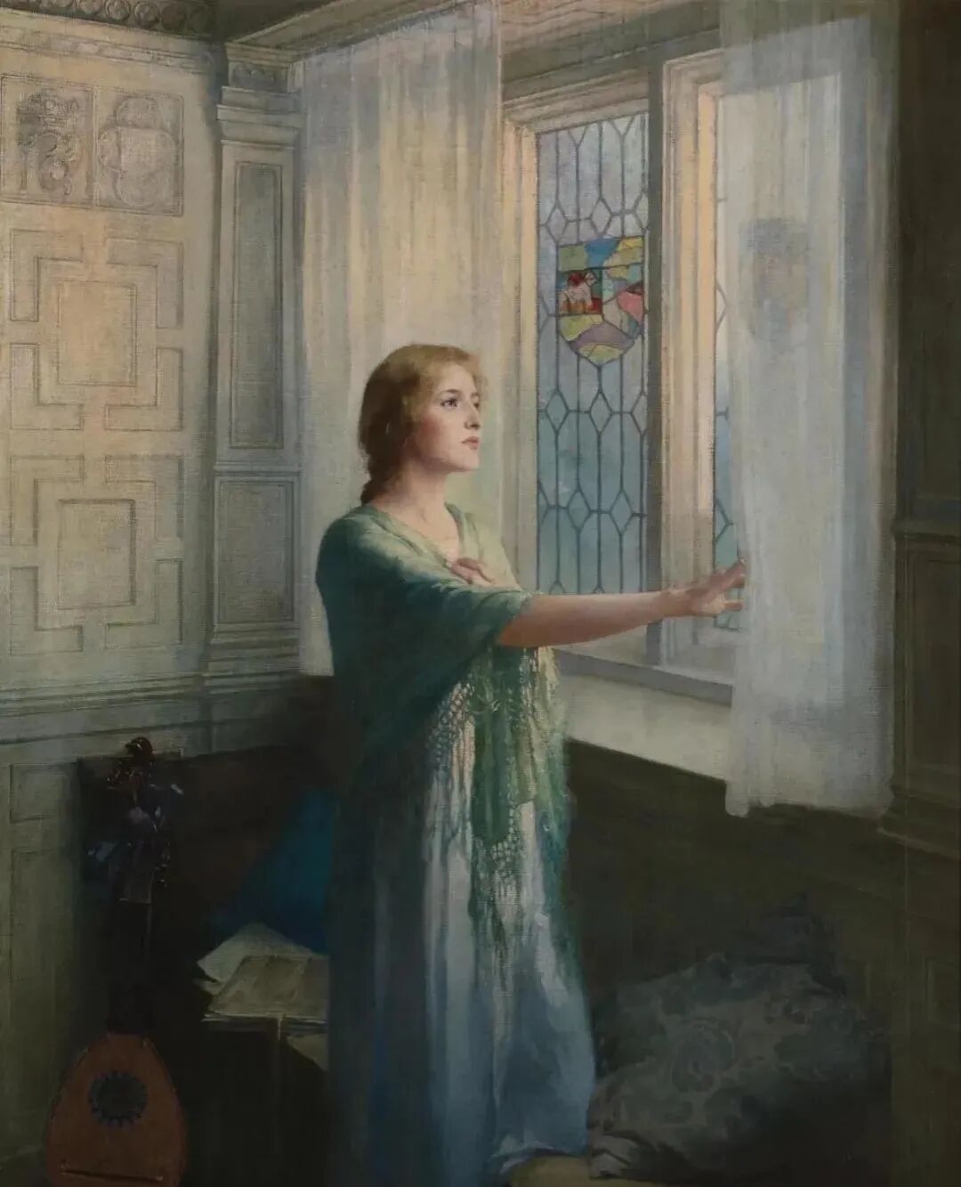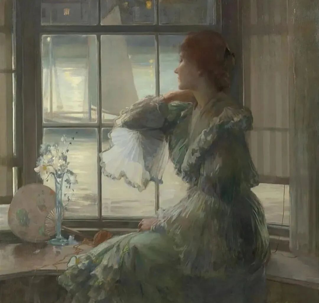 一扇窗,窗内窗外是两个世界,这位苏格兰画家把女人的泡泡袖连衣裙和窗外扬帆起航的帆船,很和谐地融为一体,给画面增添了动感和活力!