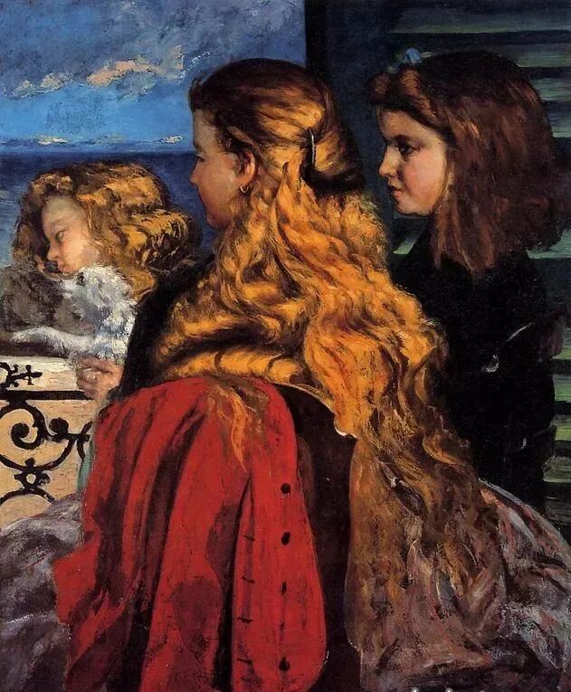古斯塔夫.库尔贝《三个英国女孩在窗前》,三个女孩共同憧憬和希望,期待着美好的未来,她们的梦想犹如她们的金发一样,闪闪发光!