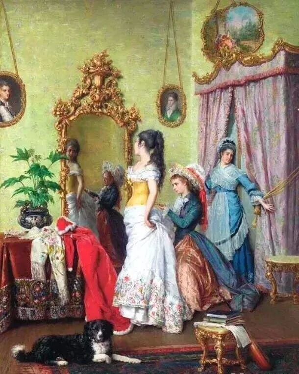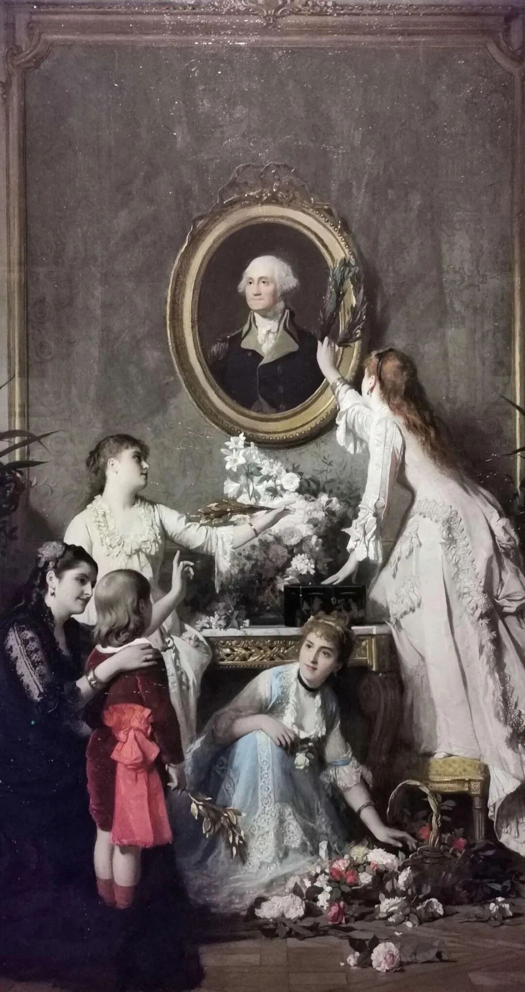 如这幅油画,讲述的是四位上流社会的小姐和一个小孩,正在美国首任总统乔治.华盛顿肖像前献上鲜花💐,表示崇高的敬意!其中有一位女士还指着肖像,在对孩子介绍着,说明当时市民是非常爱戴这位总统的!
