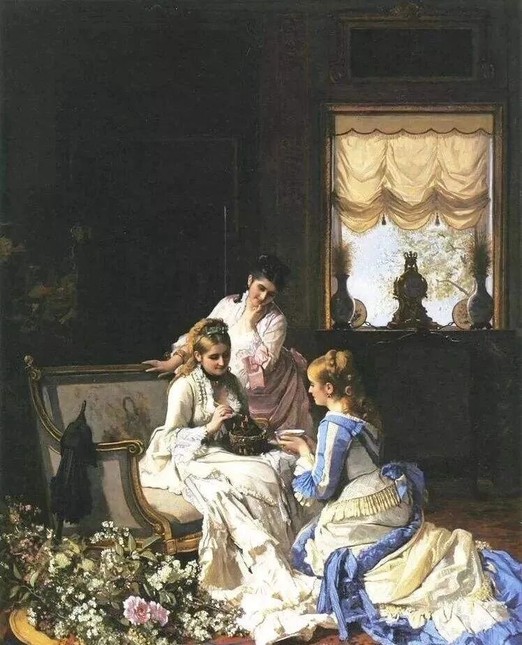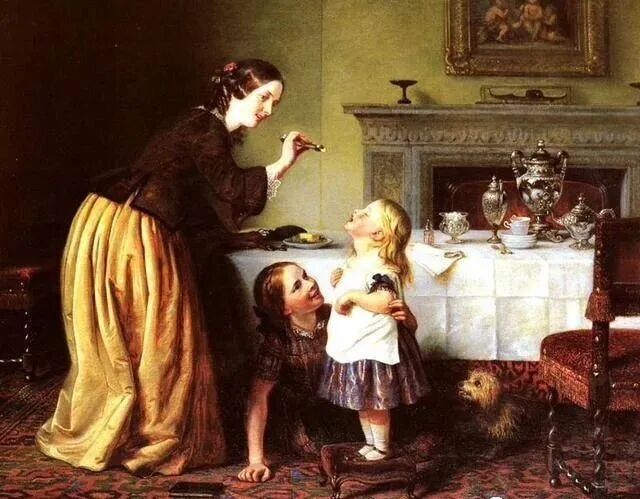 如这幅吃早餐的场景,从整个画作的背景来看,肯定是上流社会的一户人家,母亲准备喂孩子吃糕点,孩子正张开嘴巴,地毯上的小狗🐶很妒忌地望着,旁边的小姐姐则很开心地在逗妹妹玩!画面生动有趣,形象逼真,栩栩如生,充分展示了巴格涅特的绘画技巧!