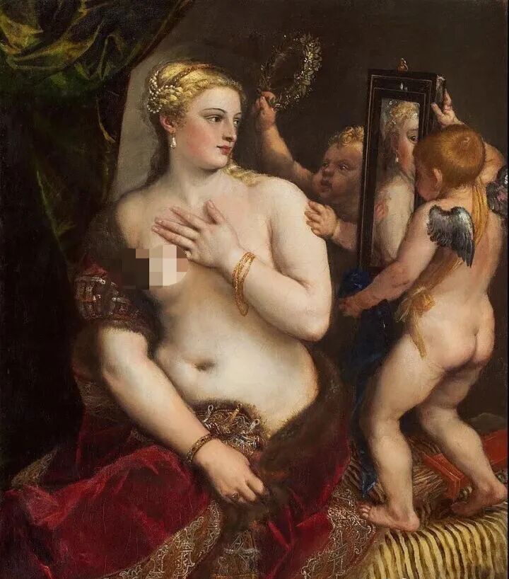 其实在后来的创作生涯中,他利用鲜明的色彩和人物之间的动感,把这种创作模式发挥得更加淋漓尽致!如这幅《照镜子的维纳斯》,肌肤的光泽,丘比特小爱神,还有两面镜子,就把画面塑造得如此鲜活灵动,活色生香,就像一道菜,可谓是色香味俱全!