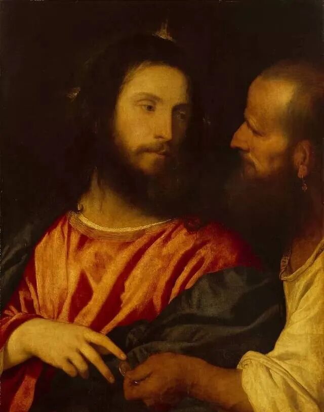 这幅取名《捐款》,我们注意基督和皇帝的手,还有他们不同的眼神,一边是心无杂念慷慨地捐出,一边是心口不一中饱私囊,想占为己有!最简单的人物肖像,无私的基督与伪善的皇帝在小小的一幅画中,形成了鲜明的对比!