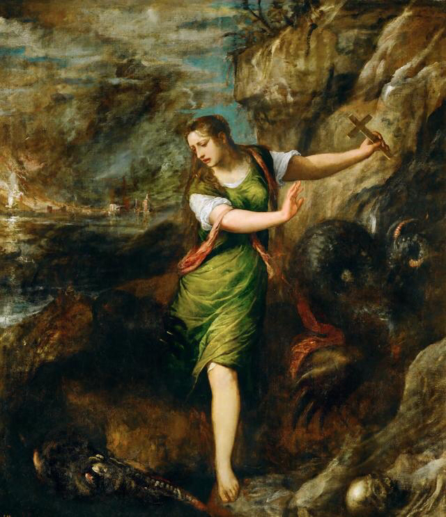 《圣玛格丽特与龙》,仅从画面看,这应该是一个宗教故事,感觉圣玛格丽特正拿着十字架,在感化一条正张开血盆大口的龙,对于基督教我不太懂,我比较信仰佛教!