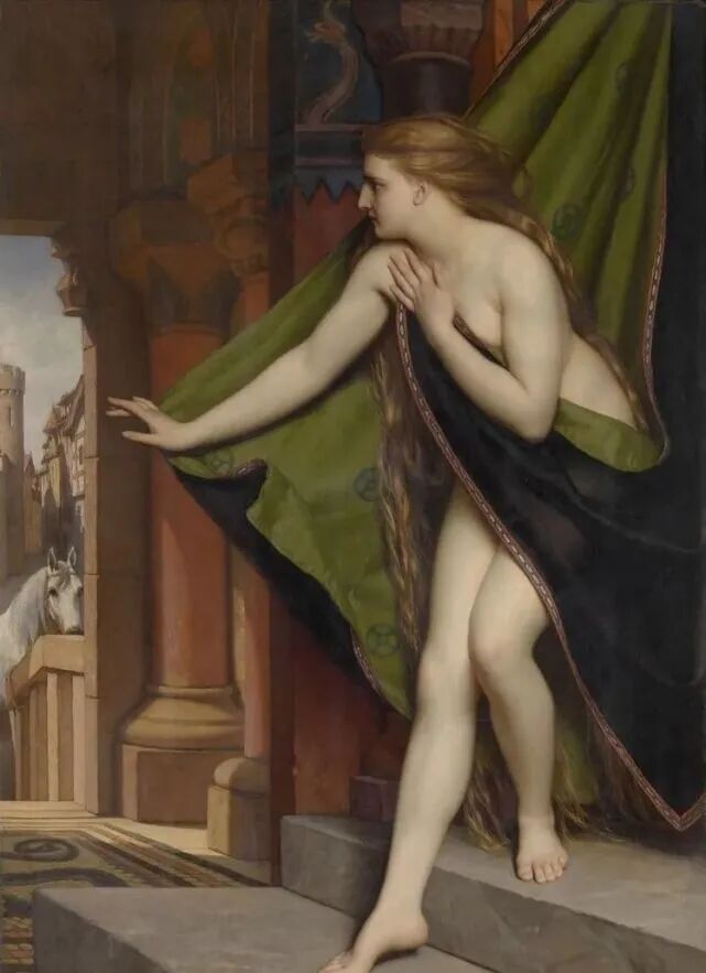 为了减轻赋税,美丽高贵的戈黛瓦夫人和丈夫打赌,即将裸体骑马出门游街示众,画面展示了无畏的戈黛瓦夫人即将跨下台阶,白马已经在外面等候的场景!